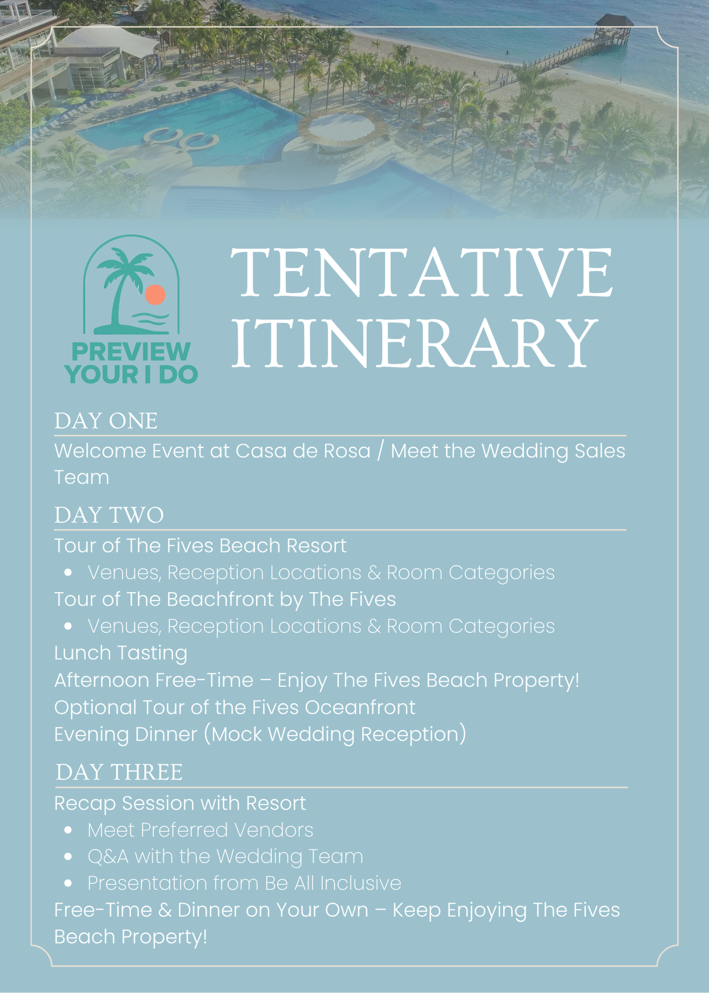 That’s why we created Preview Your I Do — exclusive destination wedding preview trips that let you experience your wedding resort before you book. You don’t have to rely on photos, brochures, or someone else’s opinion to make one of the biggest decisions of your life.